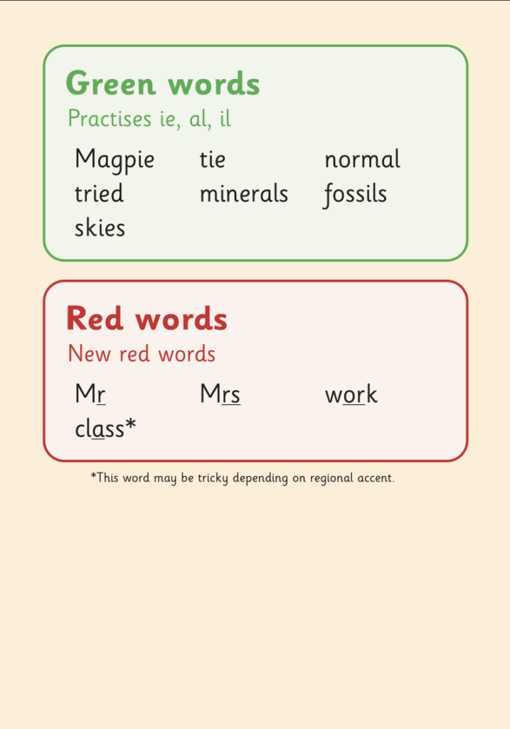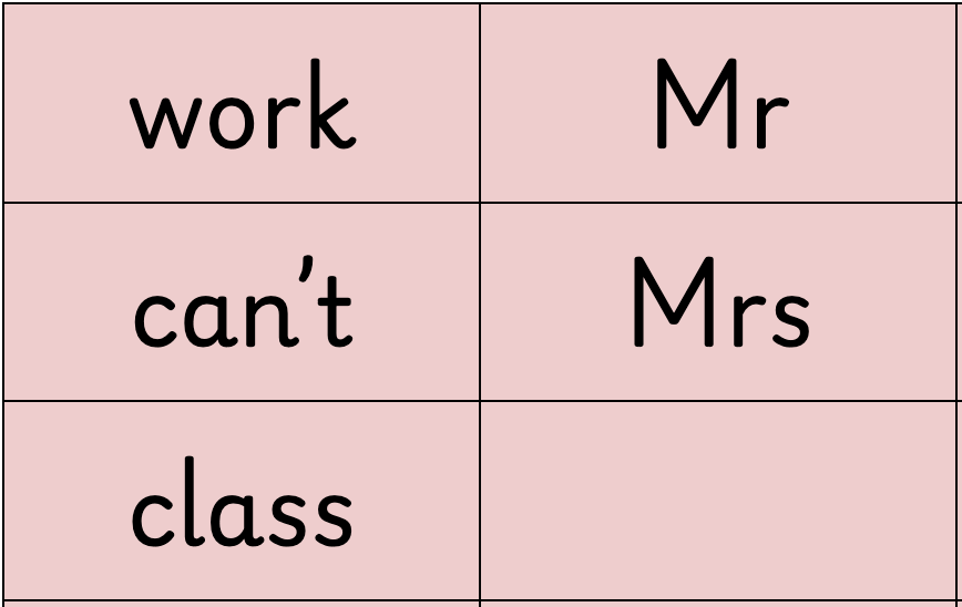 Ou® new red words or Mr, Mrs, work, can’t and class.