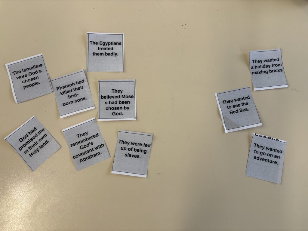 In our Religious Education session this week, we continued our learning about Moses and the Exodus of the Israelites from slavery in Egypt. We learned about their hurried meal of lamb and a flat bread called matzah, and we found out that the Jewish faith remembers and celebrates this important time in their religion via the holiday of Passover (or, Pesach in Hebrew). To consolidate our learning, we sorted reasons for the Exodus into True and False … luckily, we weren’t caught out by any of the red herrings!