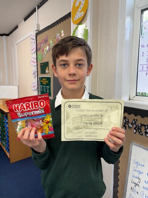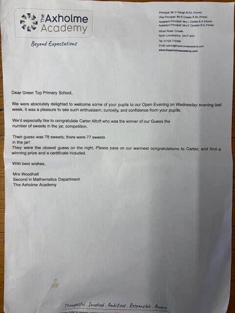 It was so lovely to receive this wonderful letter about our Year 6 children. During the transition event at Axholme Academy, the maths department had a guess the number of sweets in the jar competition. What a surprise that one of our children was the closest in their guess! Carter has gone home today with a bag of sweets, certificate and a copy of the letter. Well done!