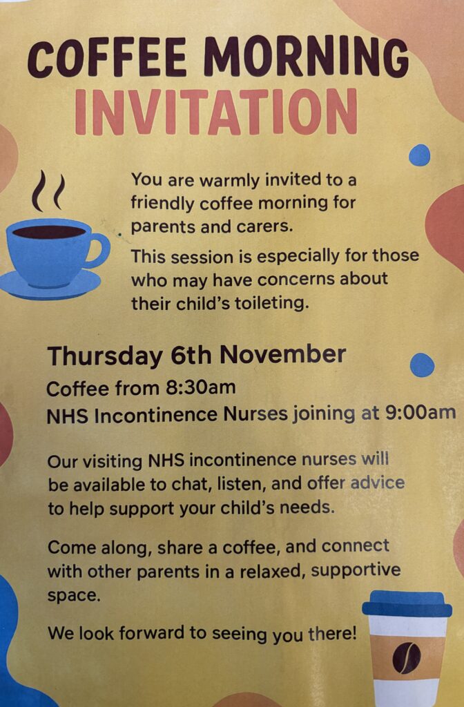 Nursery: Coffee Morning on Thursday to support with toileting your child.