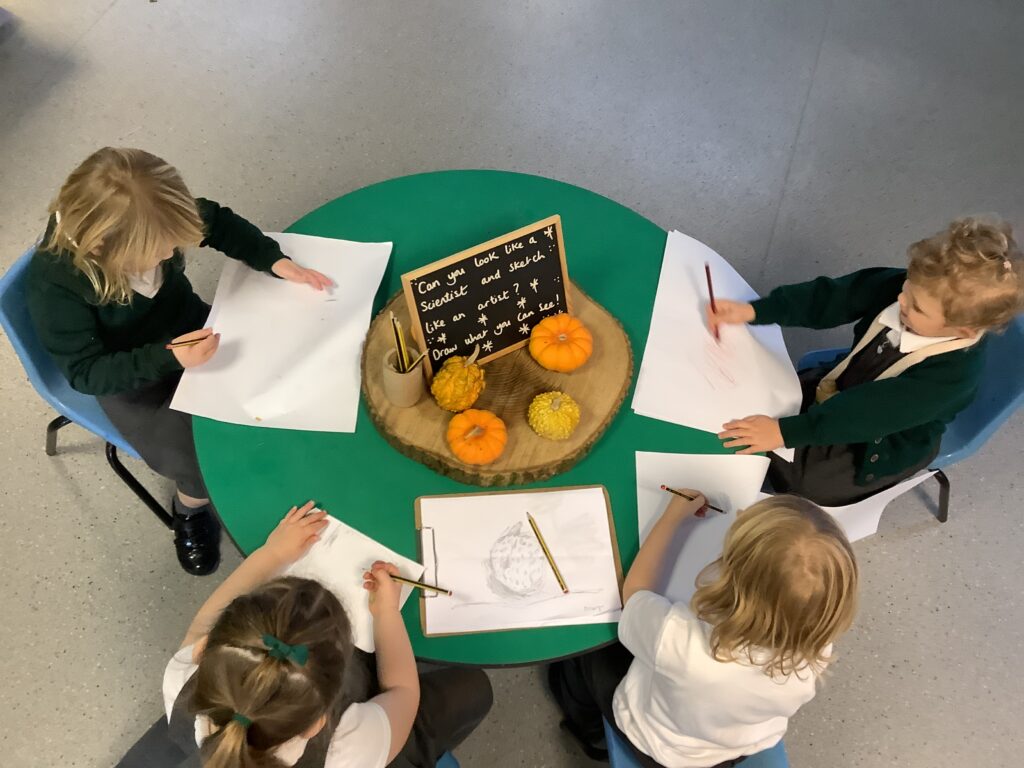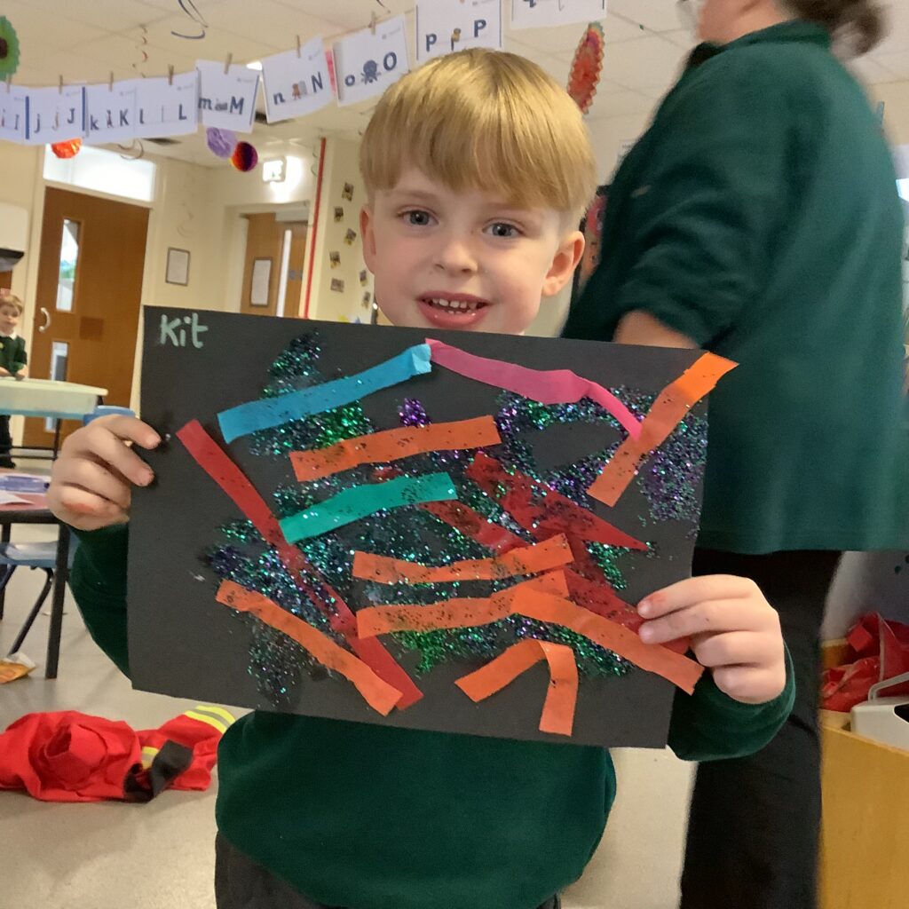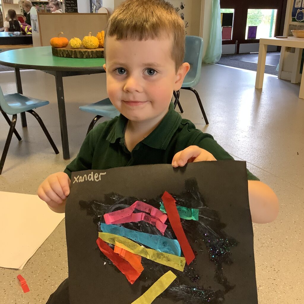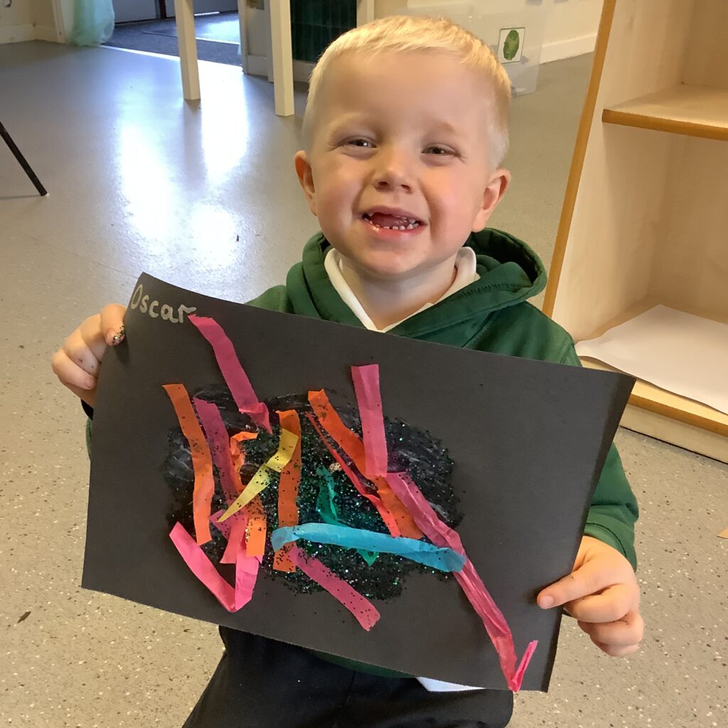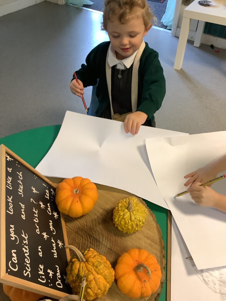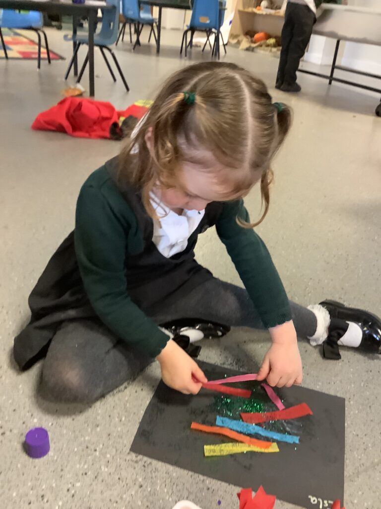 Firework crafts underway here in Nursery. Lots of wonderful conversations about colour, sparkles, dark and light and onomatopoeia words such as ‘bang, pop, fix, shoot’. The children have also been looking like scientists and sketching like artists when creating observational drawings of the pumpkins.