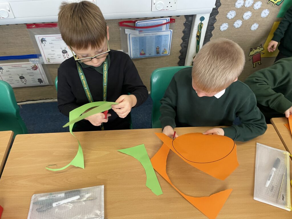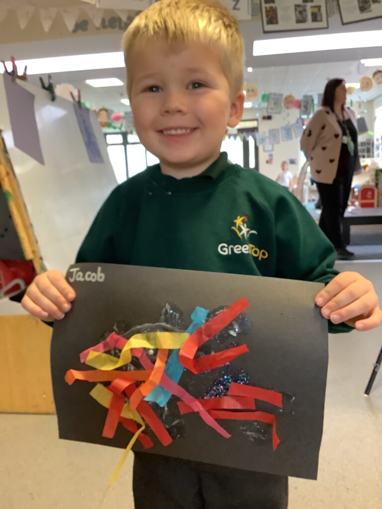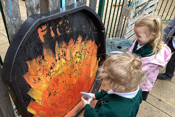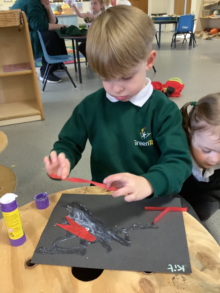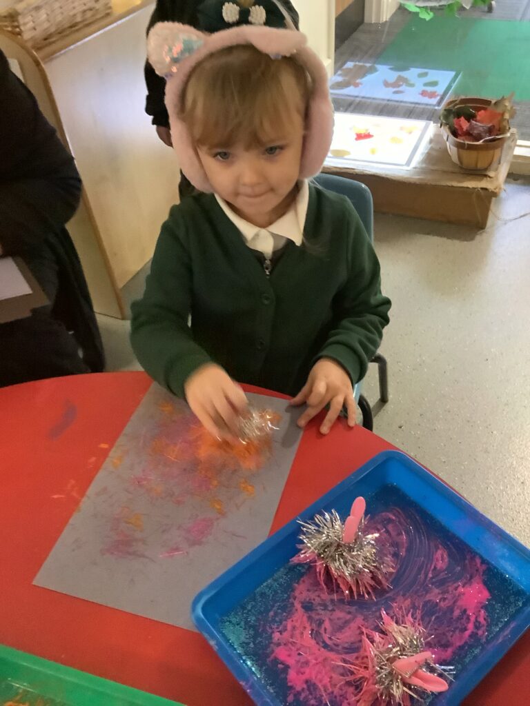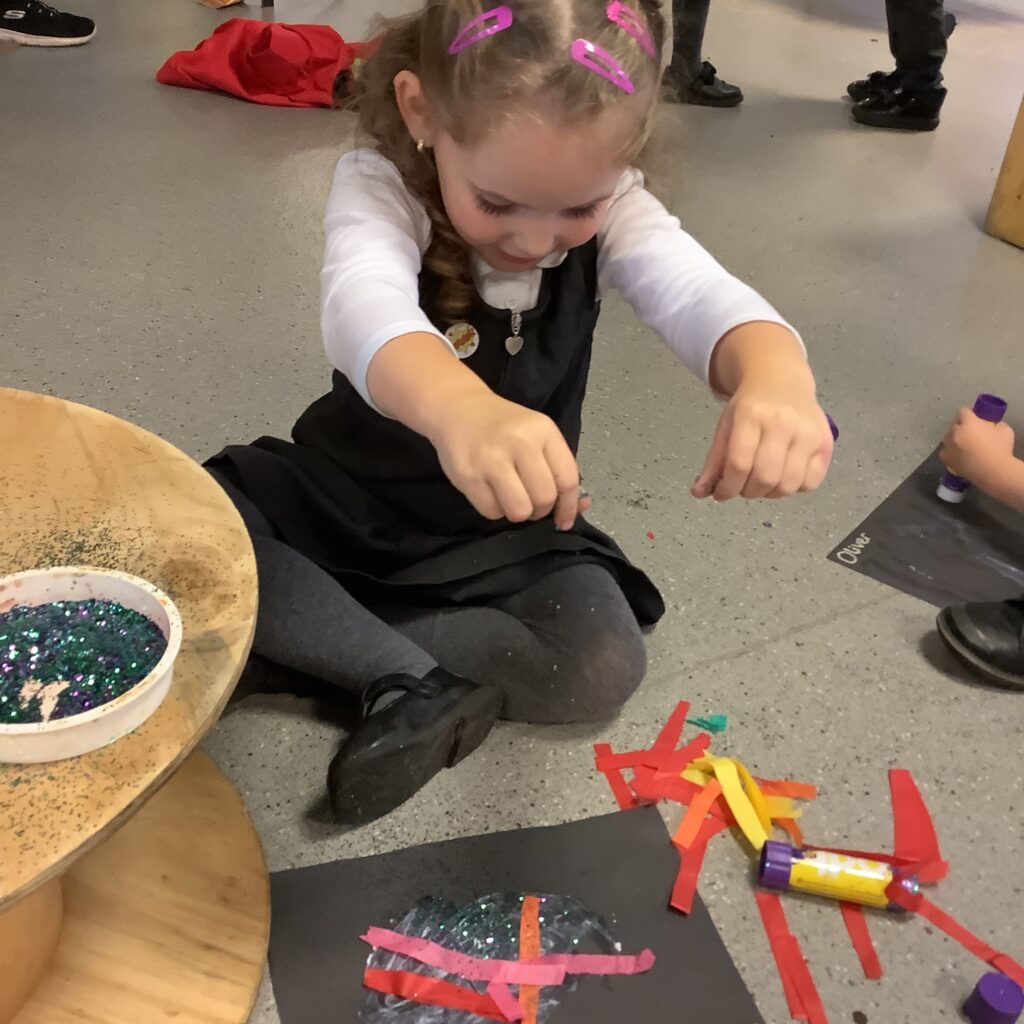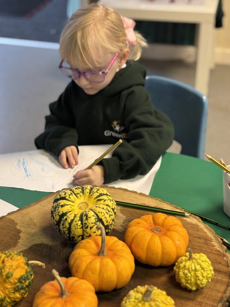 Firework crafts underway here in Nursery. Lots of wonderful conversations about colour, sparkles, dark and light and onomatopoeia words such as ‘bang, pop, fix, shoot’. The children have also been looking like scientists and sketching like artists when creating observational drawings of the pumpkins.