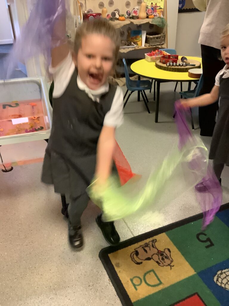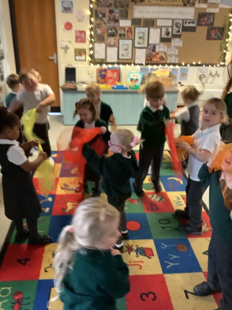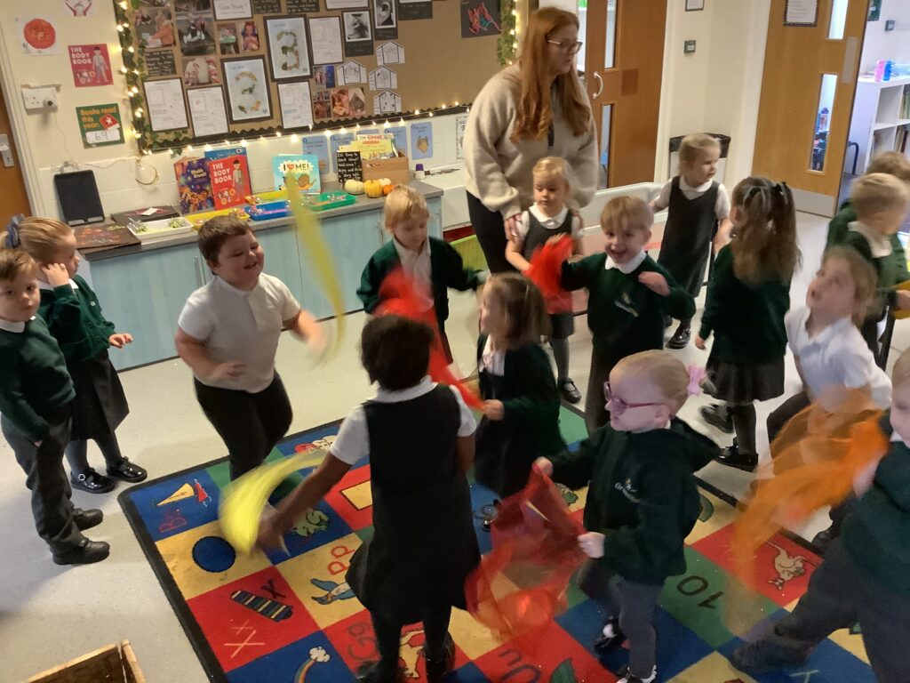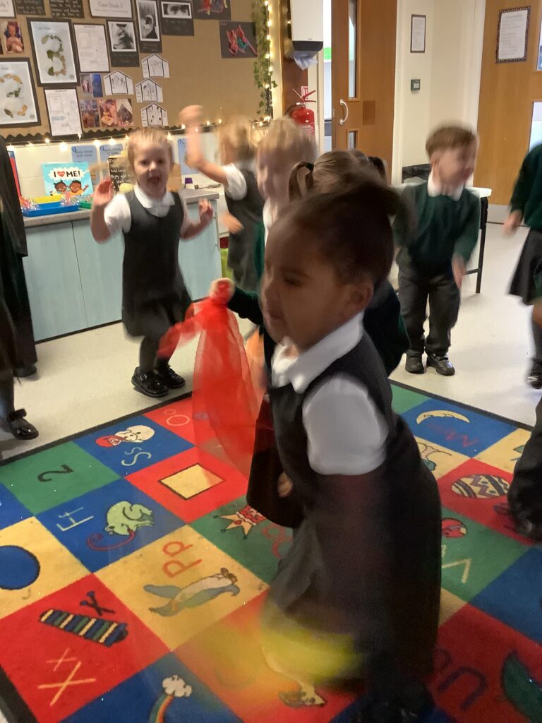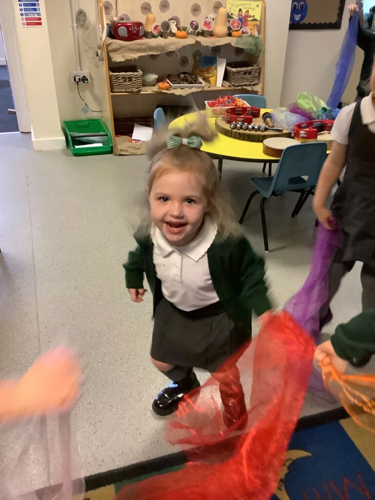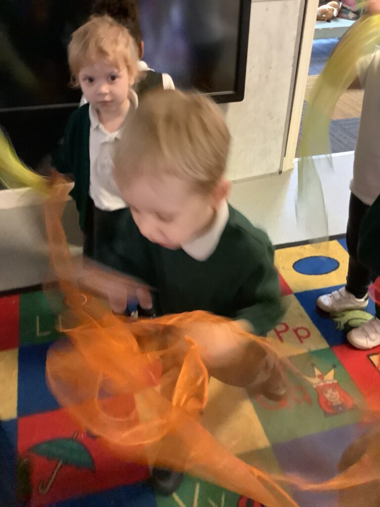 Today we have enjoyed listening to songs and dancing with scarves and imagining we are shooting up to the sky like fireworks! I think you can tell from the children’s faces how much they enjoyed this gross motor and expressive arts activity. Some children chose to also play instruments to make ‘bang’ sounds just like a firework.