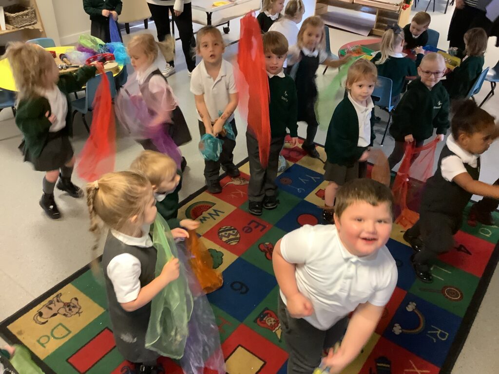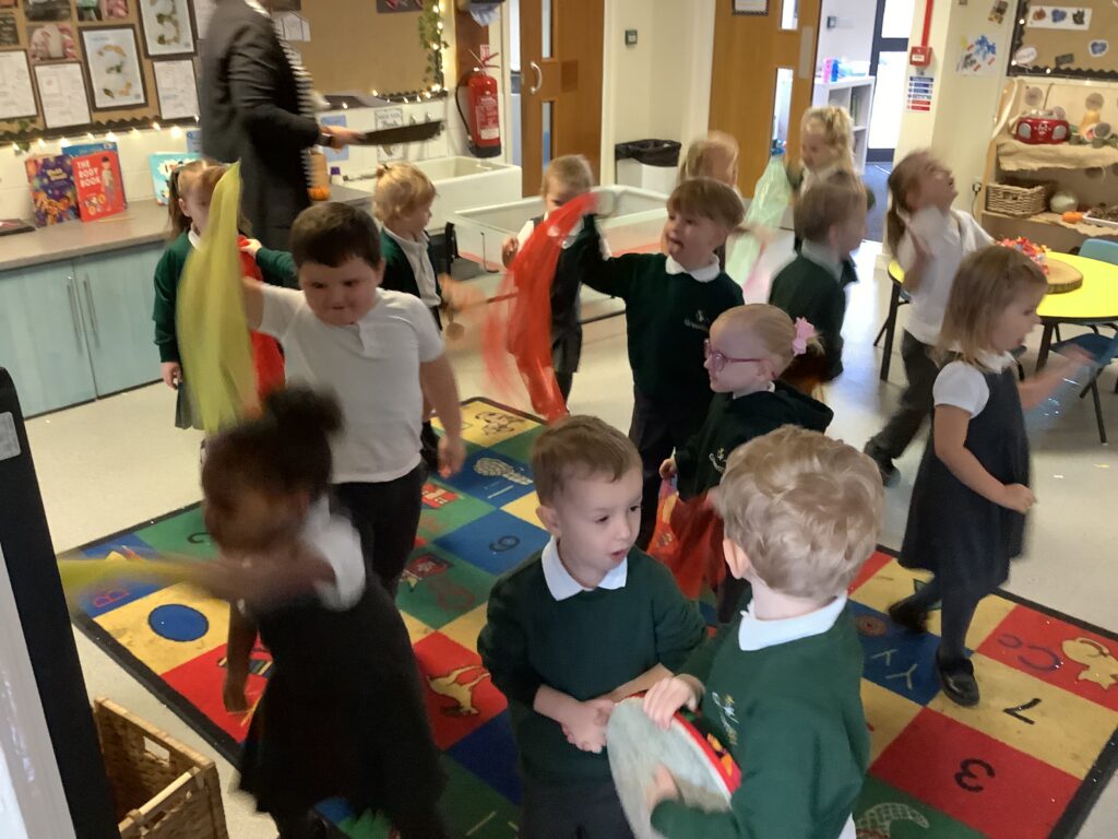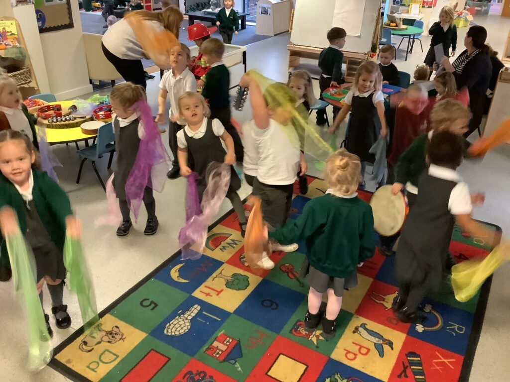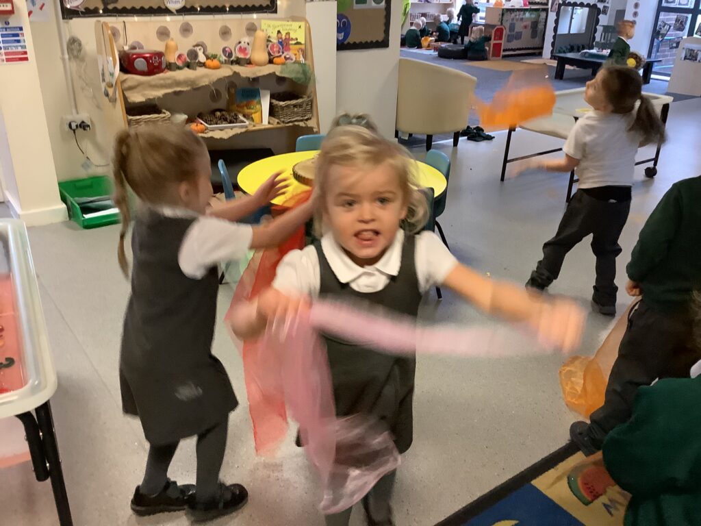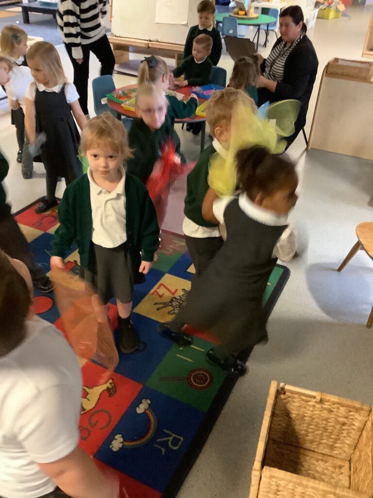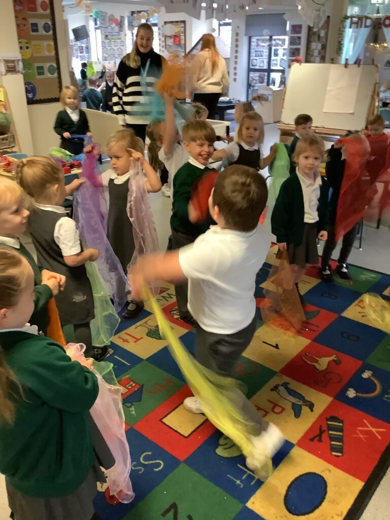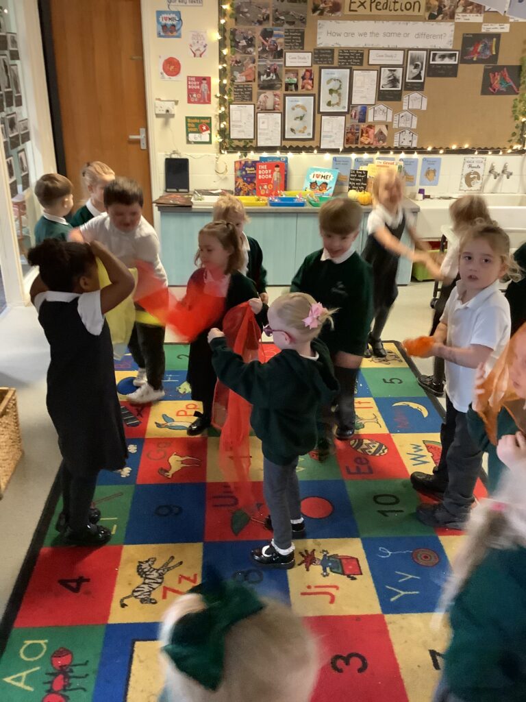 Today we have enjoyed listening to songs and dancing with scarves and imagining we are shooting up to the sky like fireworks! I think you can tell from the children’s faces how much they enjoyed this gross motor and expressive arts activity. Some children chose to also play instruments to make ‘bang’ sounds just like a firework.