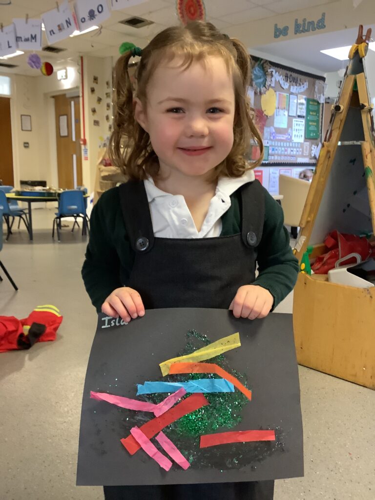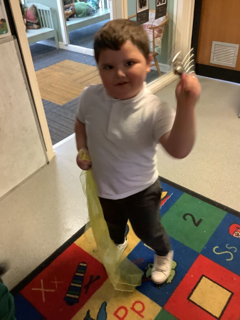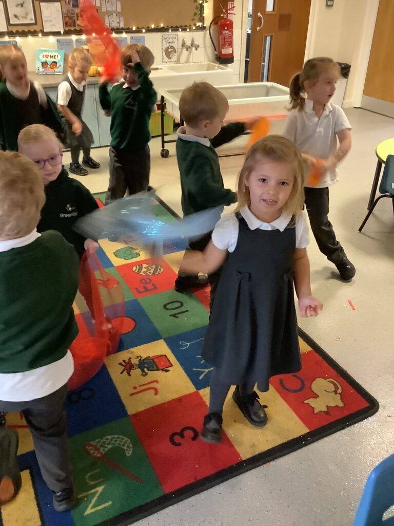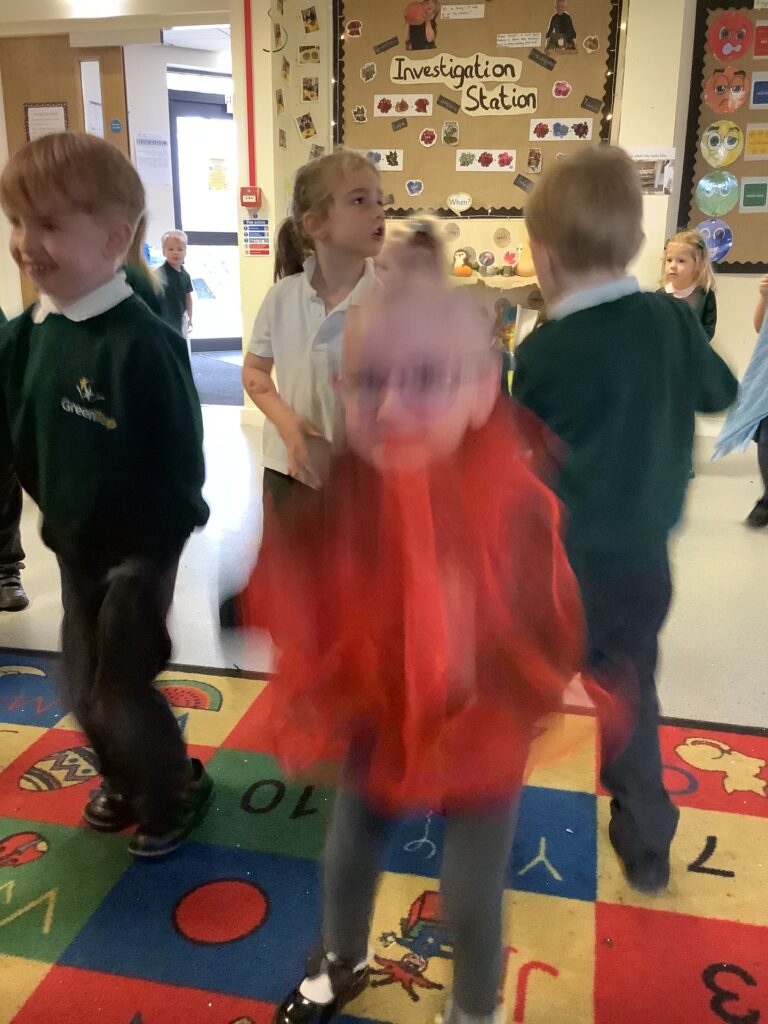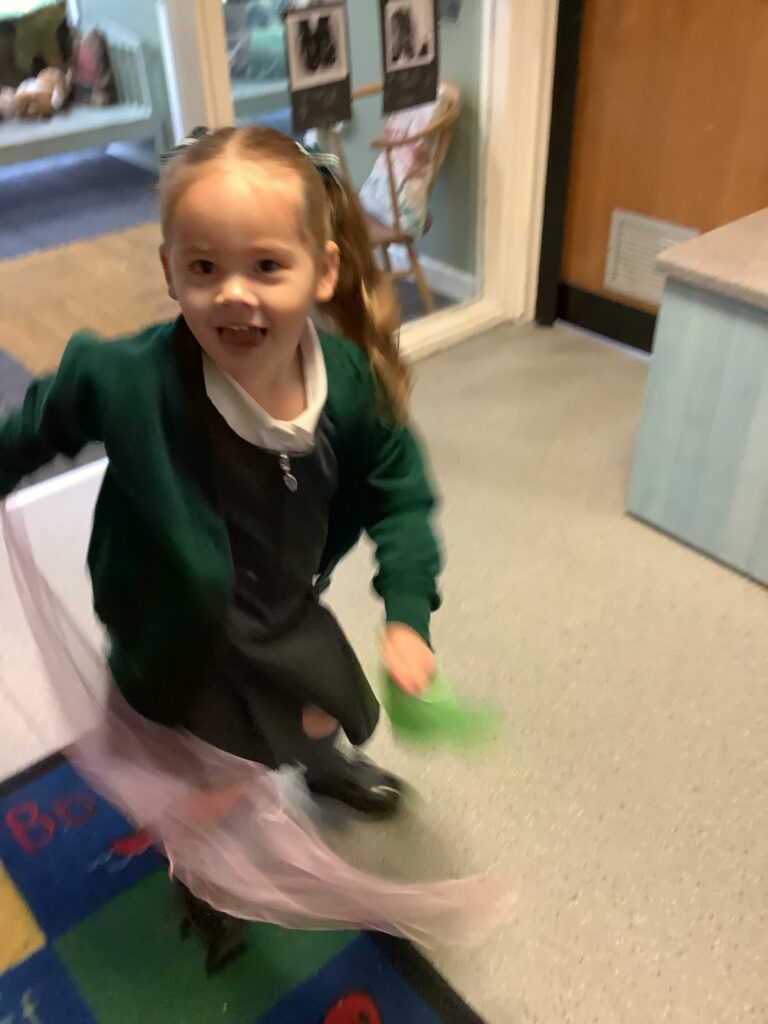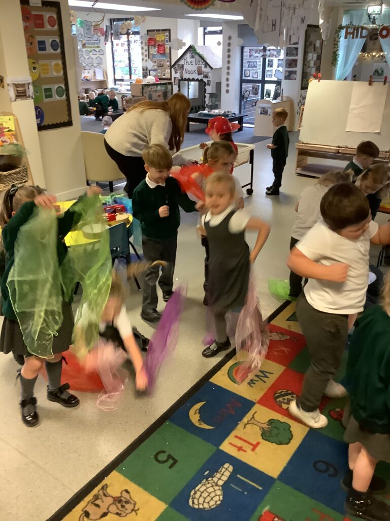Today we have enjoyed listening to songs and dancing with scarves and imagining we are shooting up to the sky like fireworks! I think you can tell from the children’s faces how much they enjoyed this gross motor and expressive arts activity. Some children chose to also play instruments to make ‘bang’ sounds just like a firework.