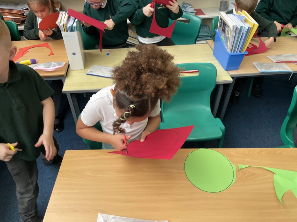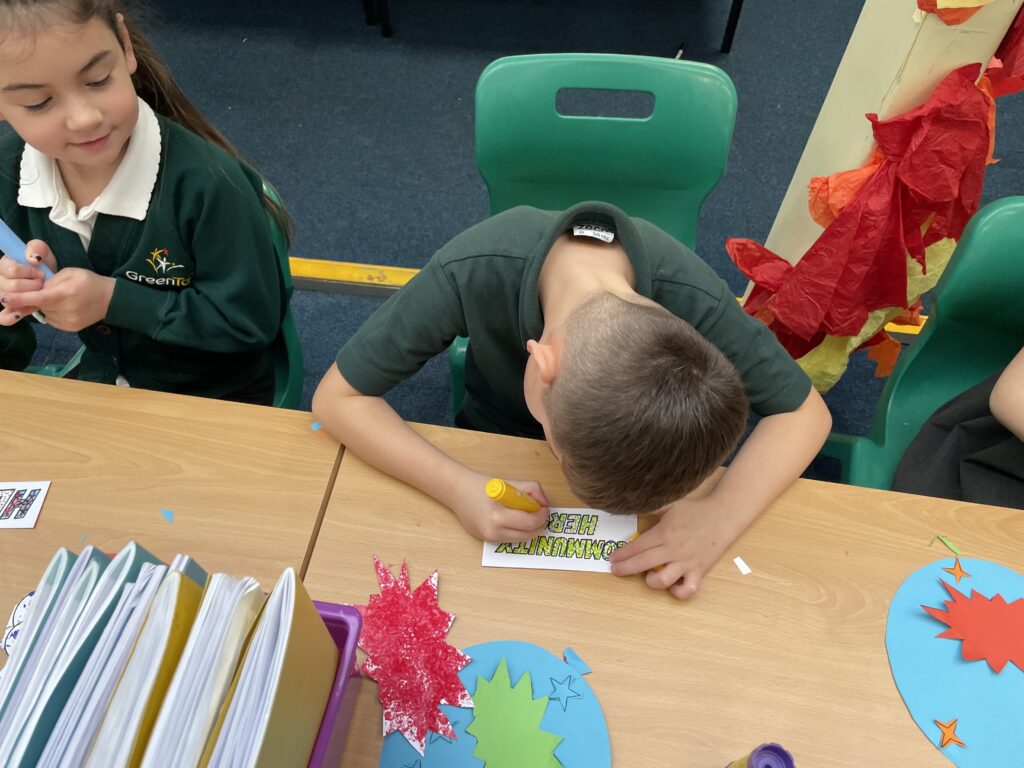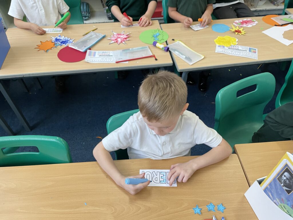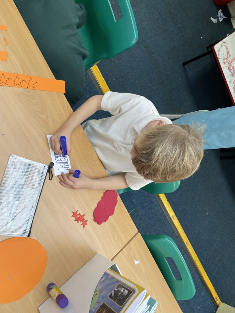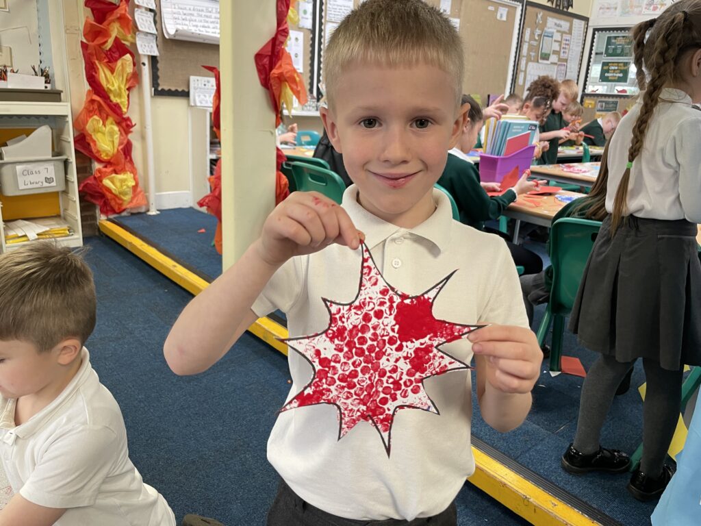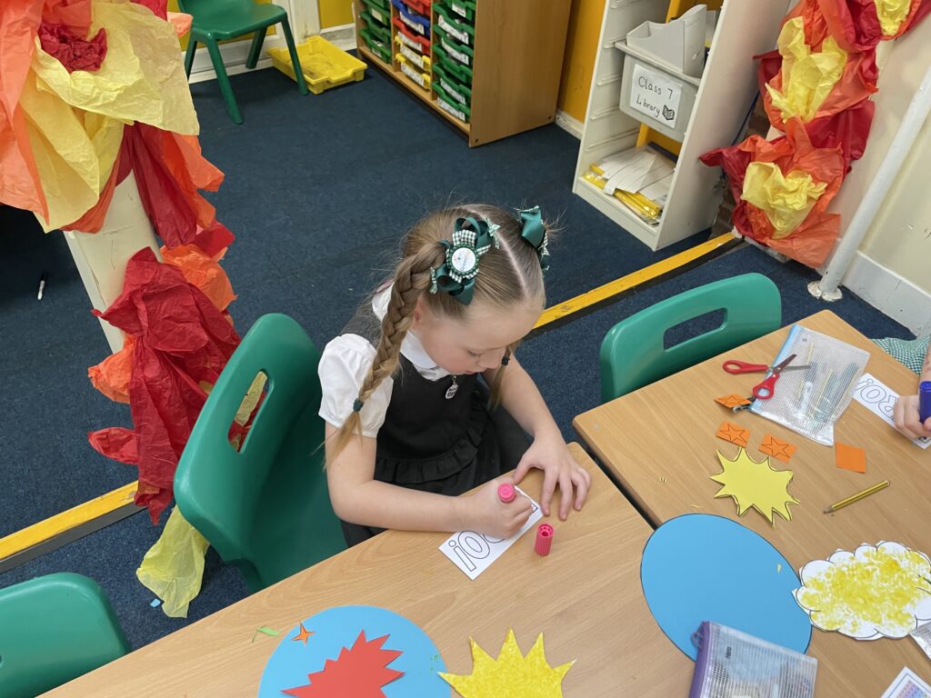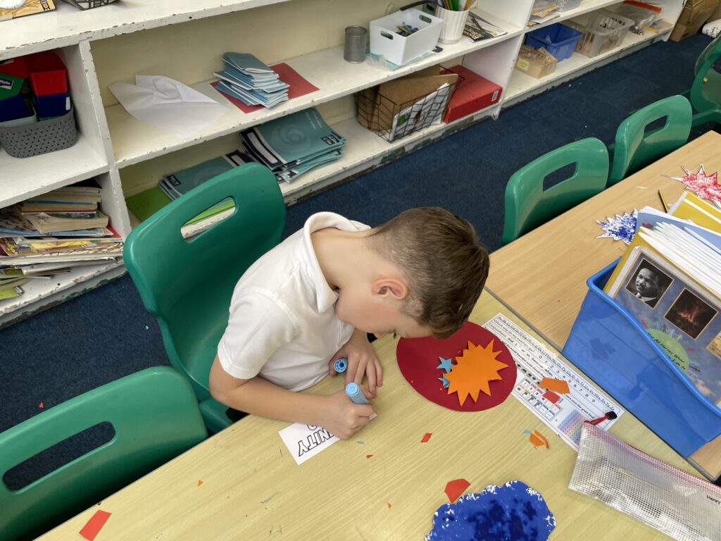 Class 7 began their pop art work! They worked hard and concentrated well on being able to cut out shapes accurately, print their dots and created beautiful pop art style patterns in their writing.