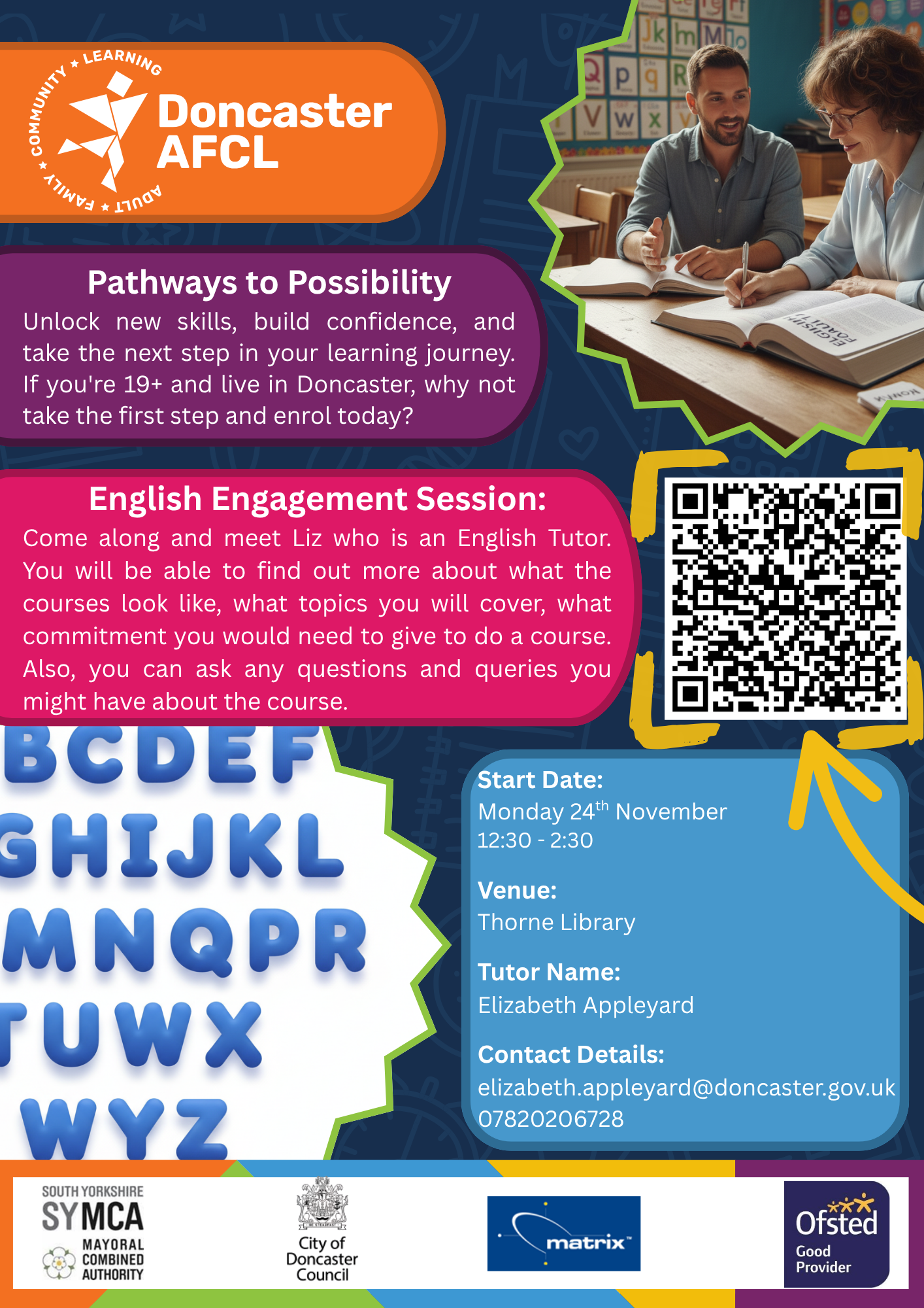 Doncaster AFCL are holding an English Engagement session at Thorne library. Please click on the link for the poster that has further details about the session.