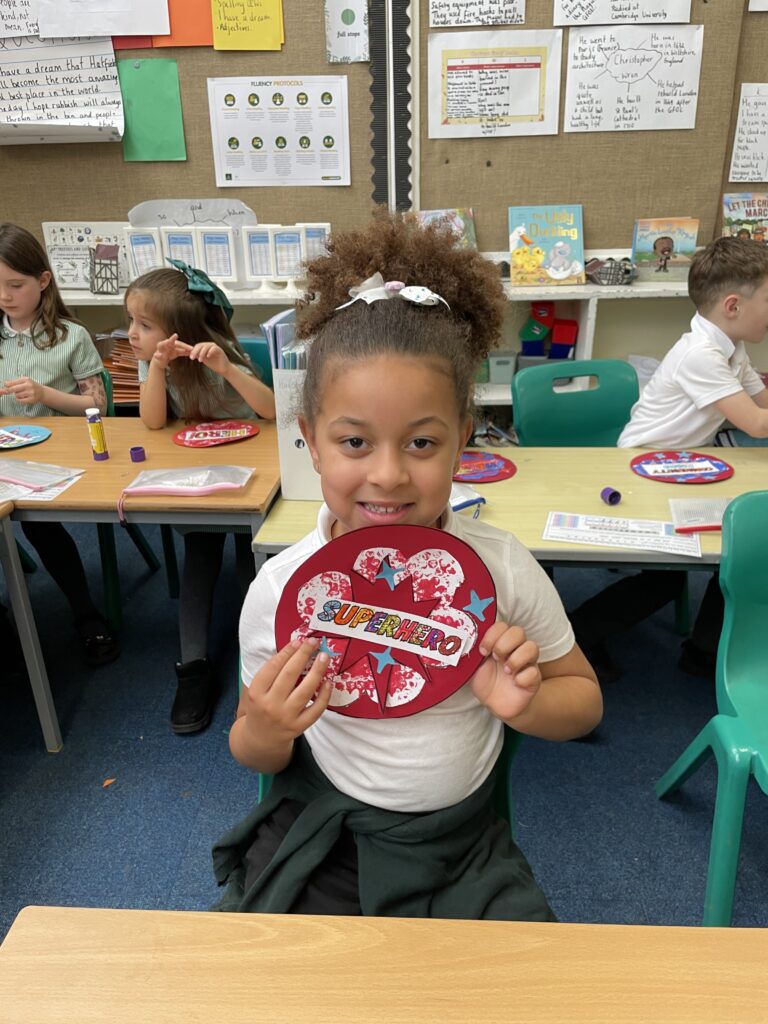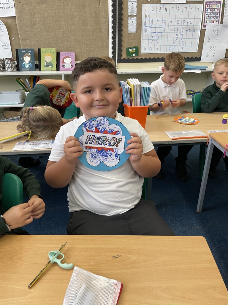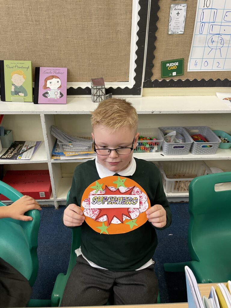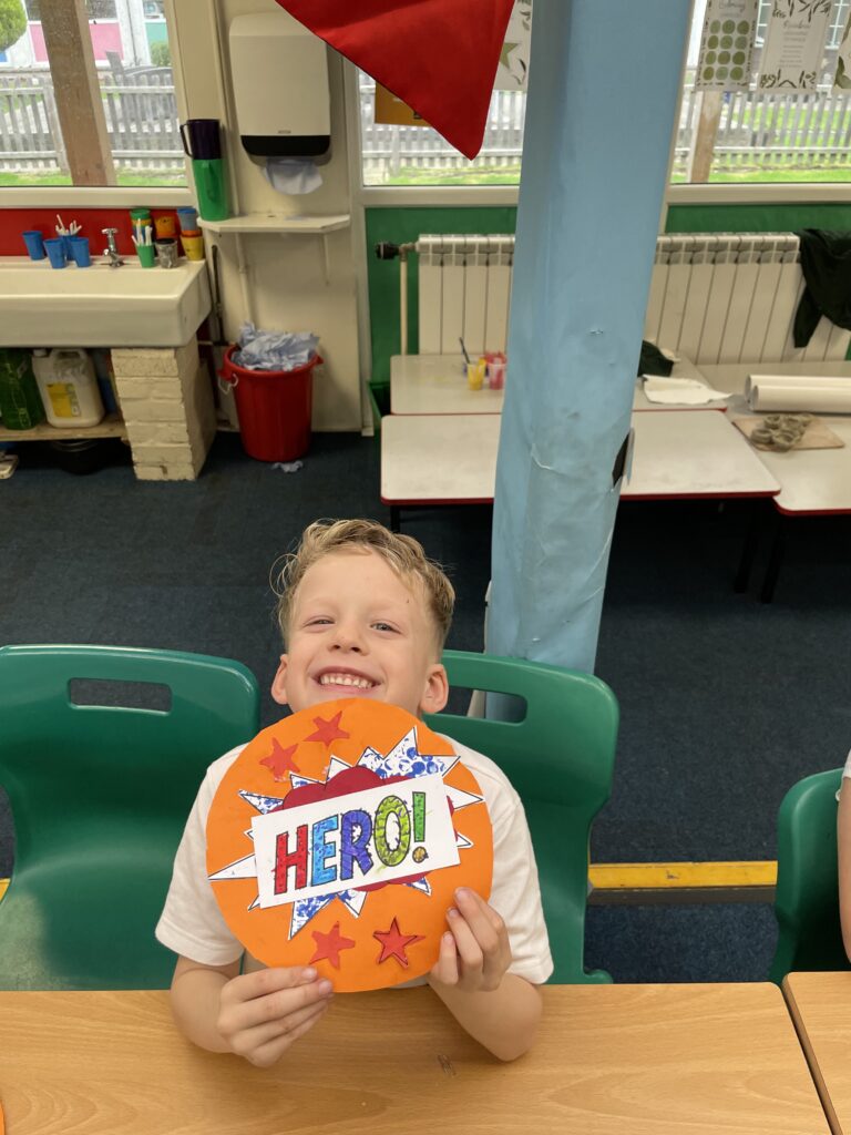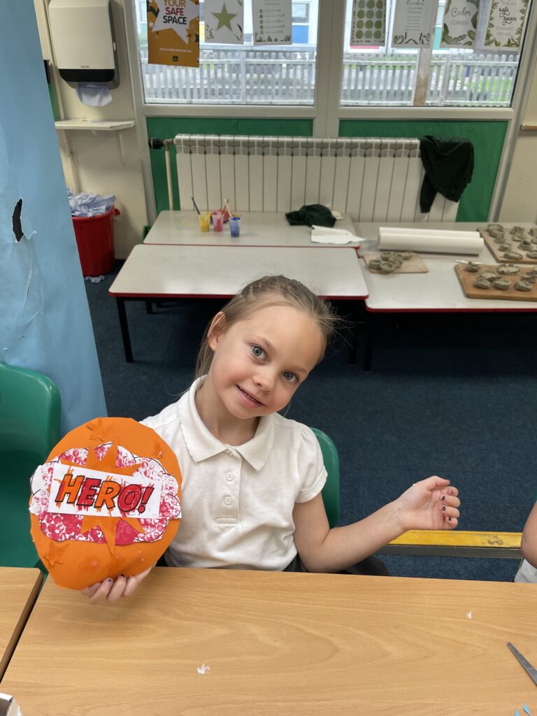 Class 7 began their pop art work! They worked hard and concentrated well on being able to cut out shapes accurately, print their dots and created beautiful pop art style patterns in their writing.