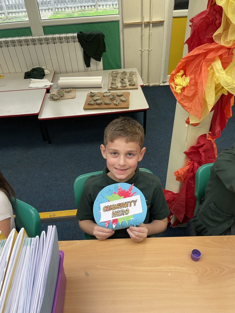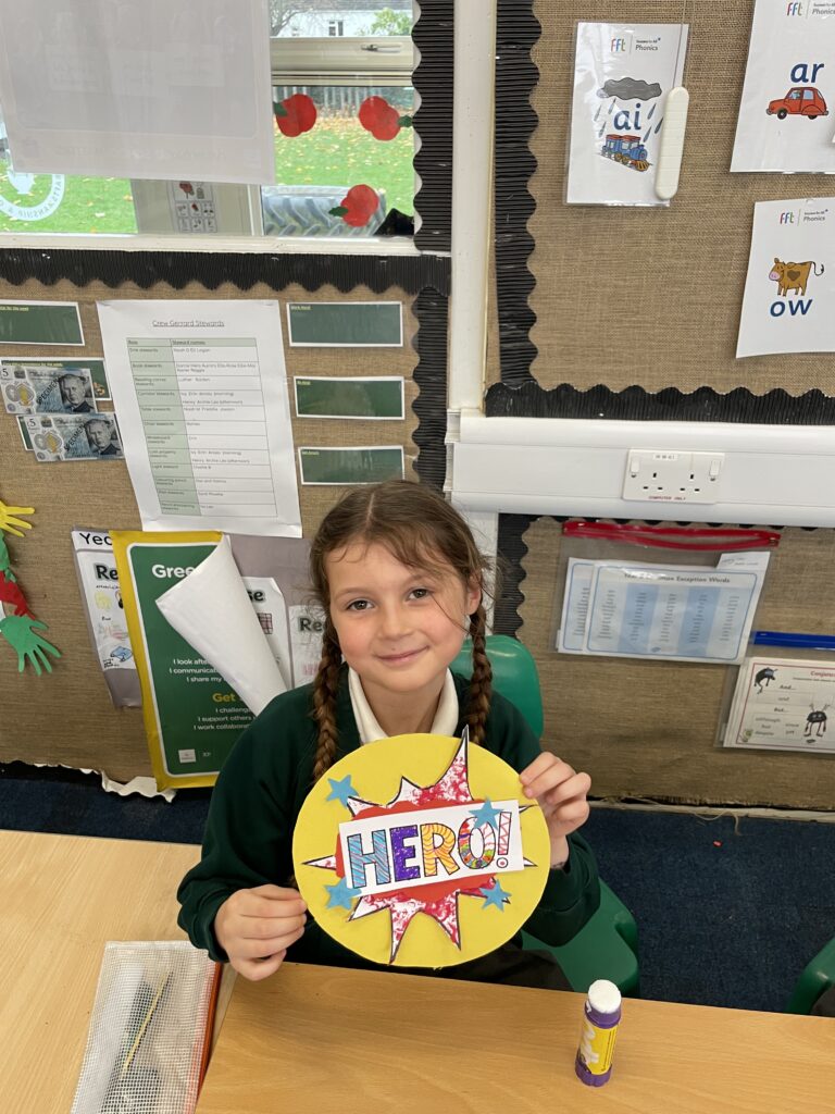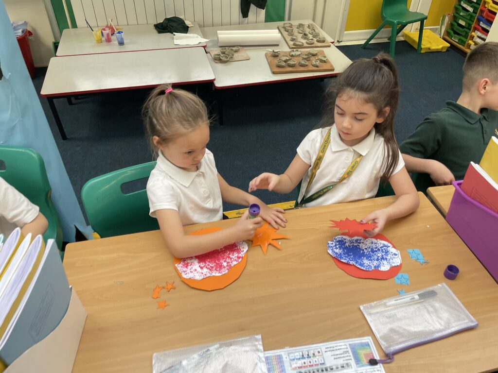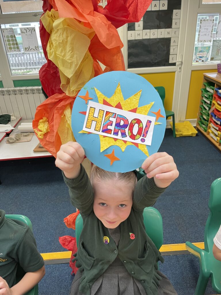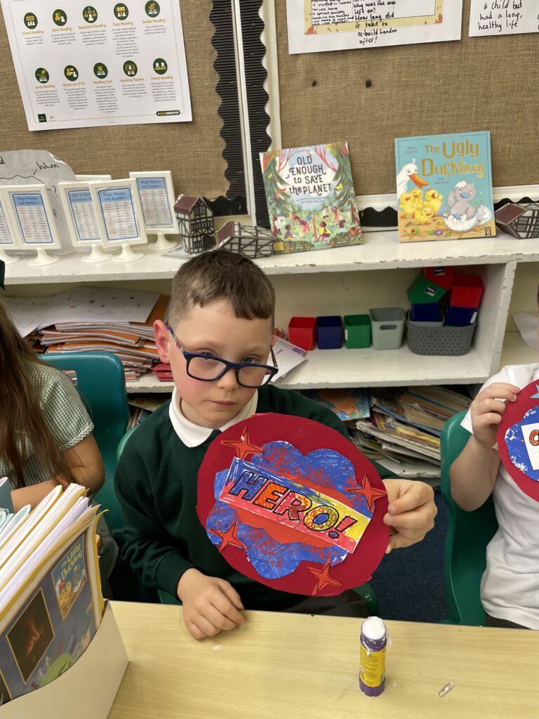 Class 7 began their pop art work! They worked hard and concentrated well on being able to cut out shapes accurately, print their dots and created beautiful pop art style patterns in their writing.