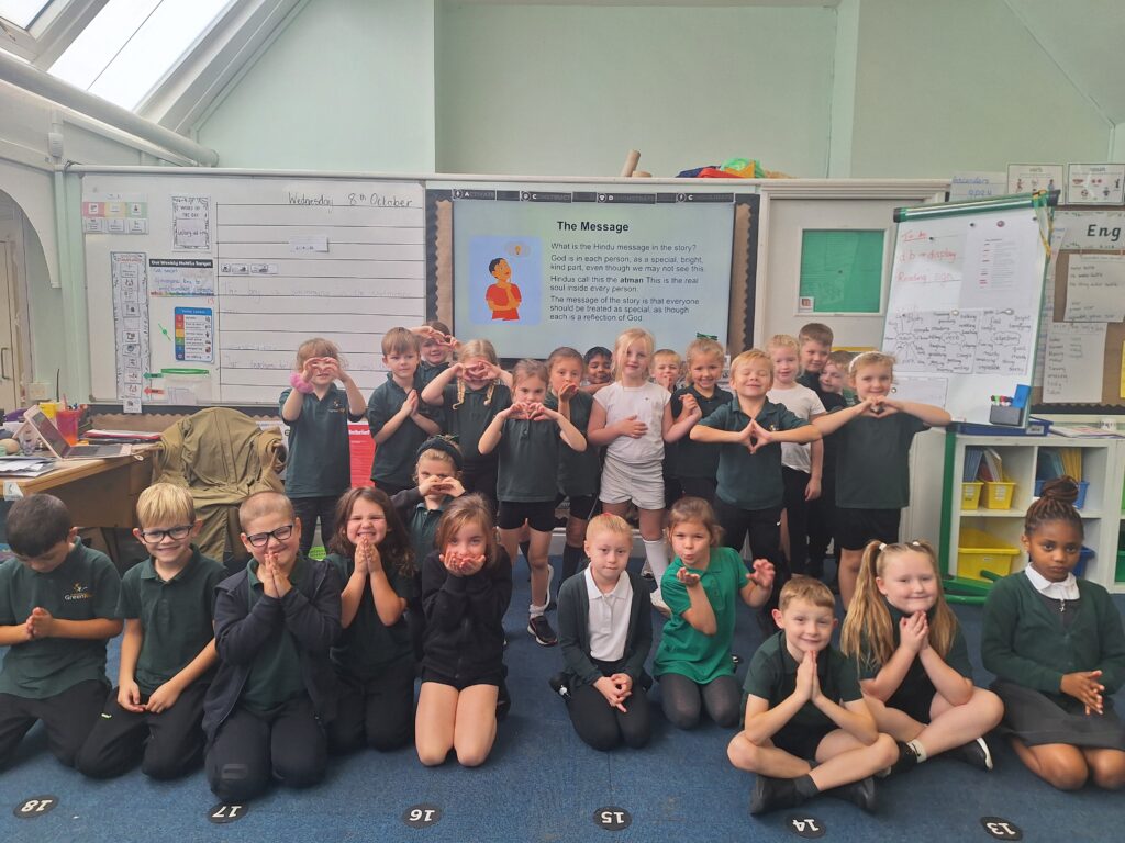 In RE today, we read a new Hindu story together. It was about a lady who wanted to meet God but she told different people to ‘go away’. It turned out that God was in all of those people- God was the kindness inside of them. We took a photo to show ways that we thought you could show kindness to others.