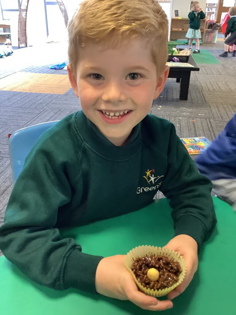 The children loved making Easter nest buns yesterday. We talked about the ingredients we used and how they changed from being a solid to a liquid during the melting process. The children chose their own bun case and mini egg colour to make them unique to them. I hope everyone enjoyed eating them. They looked and smelt delicious!