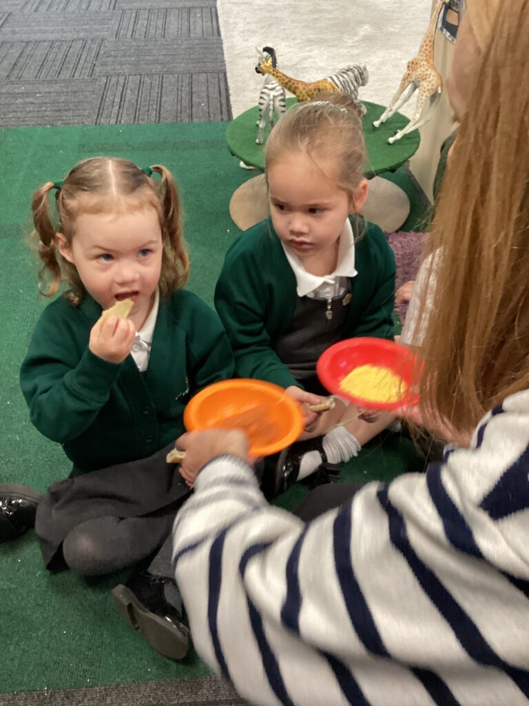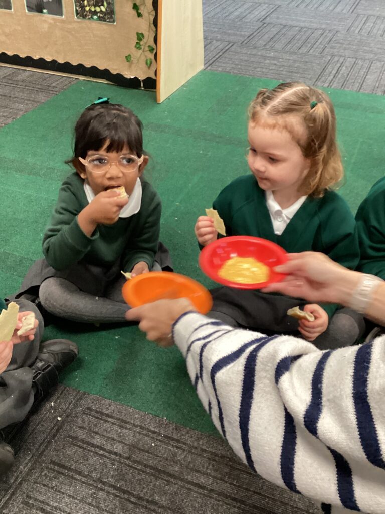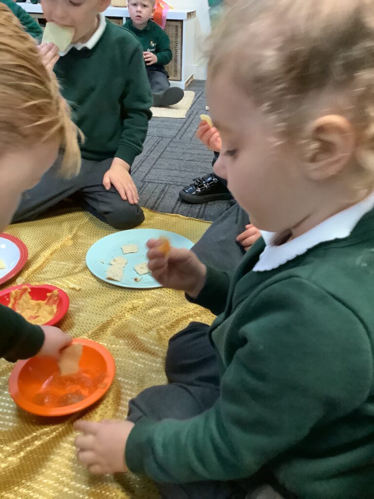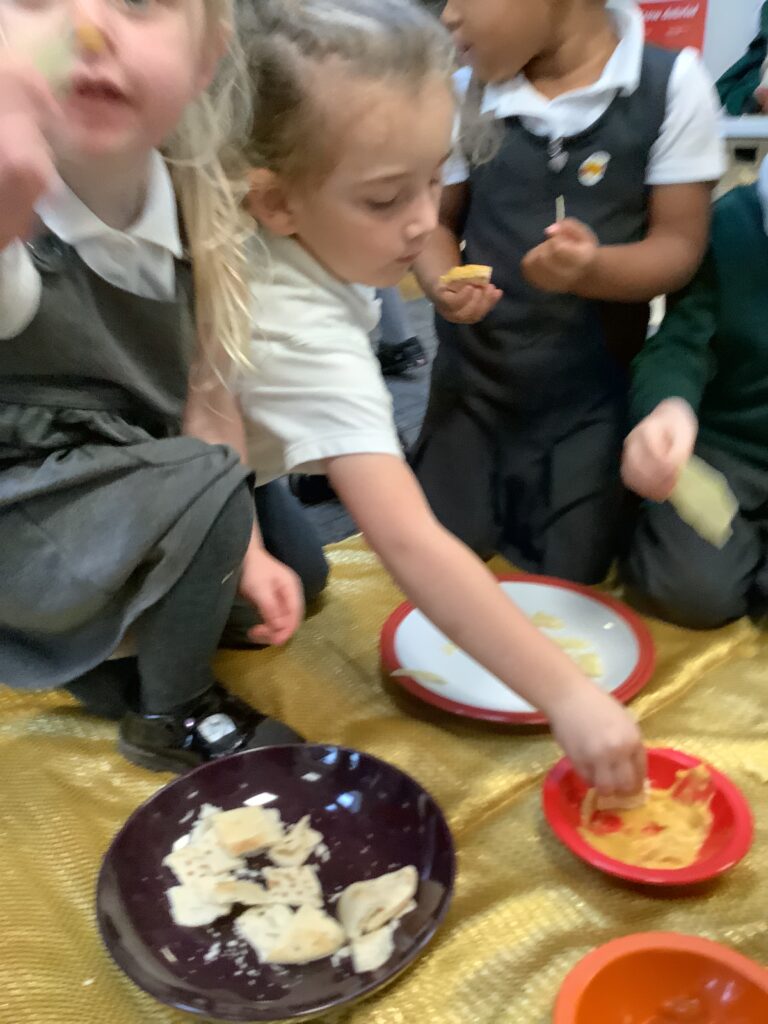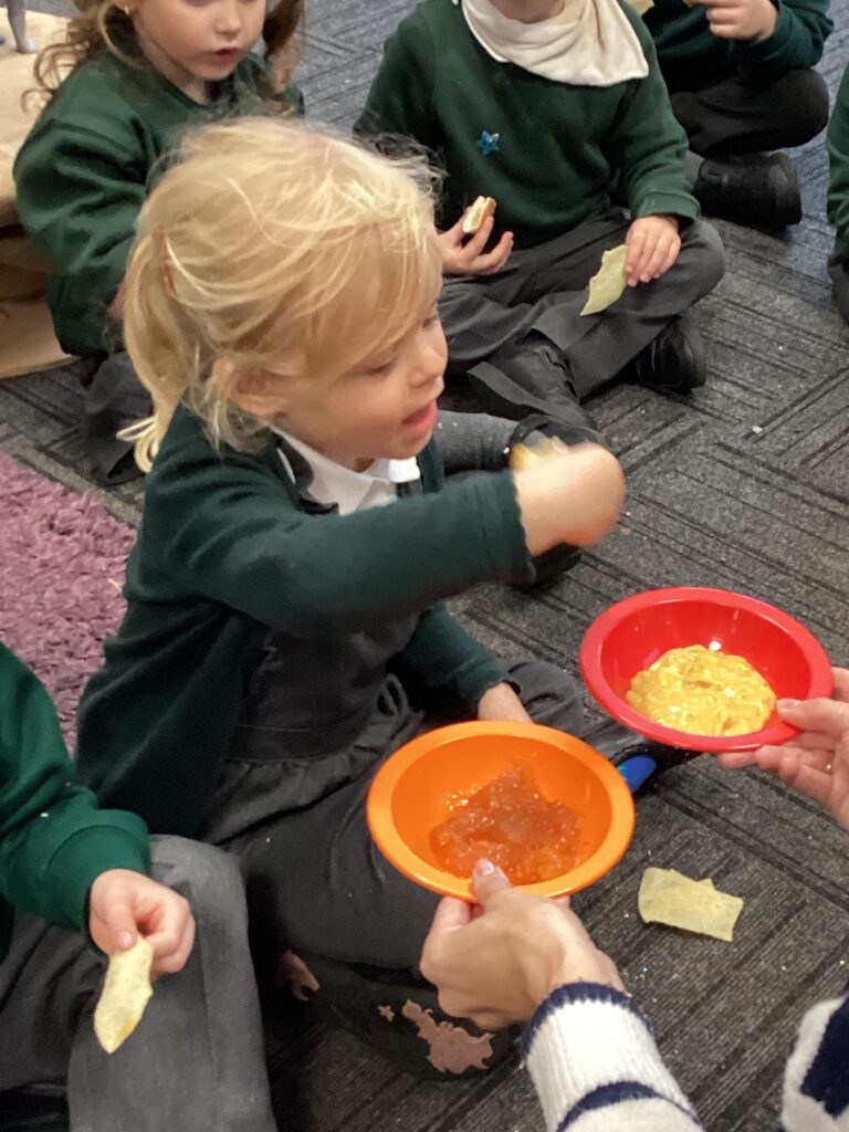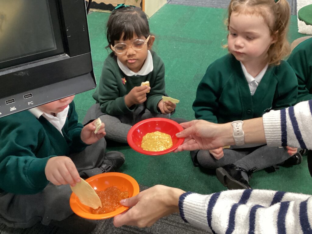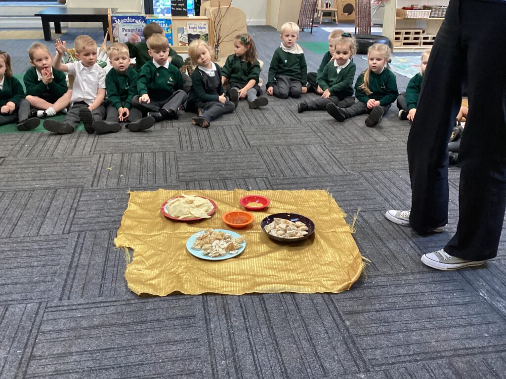 We then used our senses to smell, touch and taste some Indian foods. Some children showed courage by trying something new, you can see by their faces if they enjoyed the taste or not. Mango Chutney was a big hit with many children and they enjoyed dipping naan breads and popadoms into it.