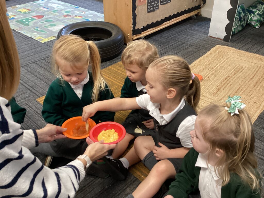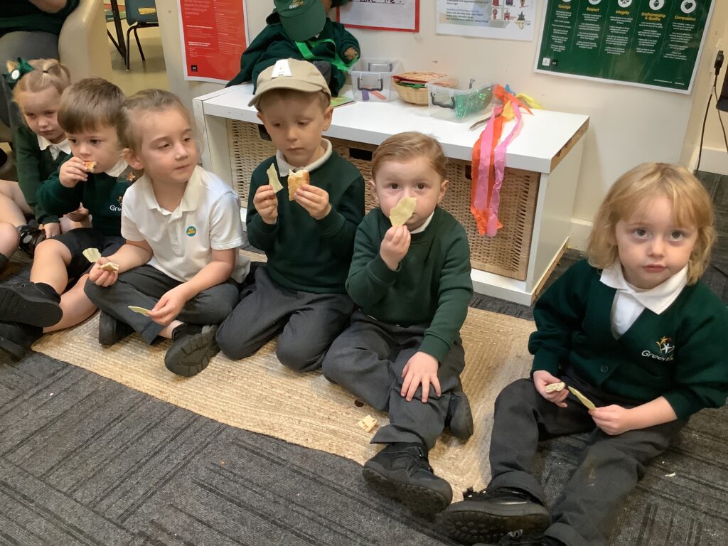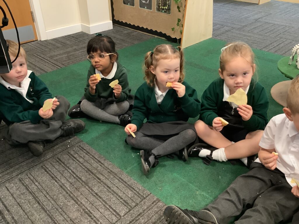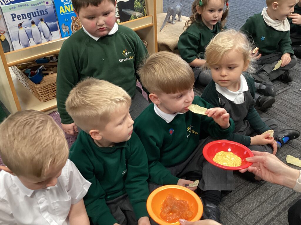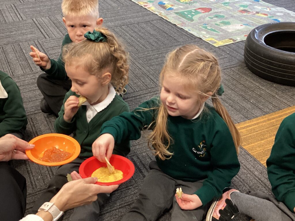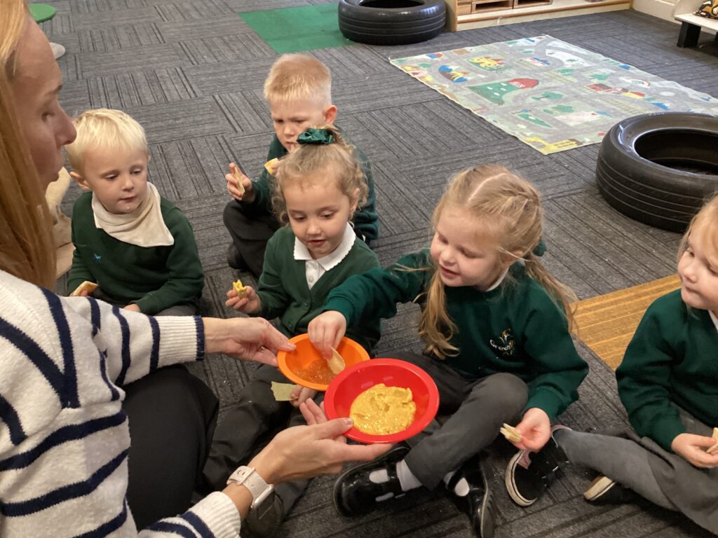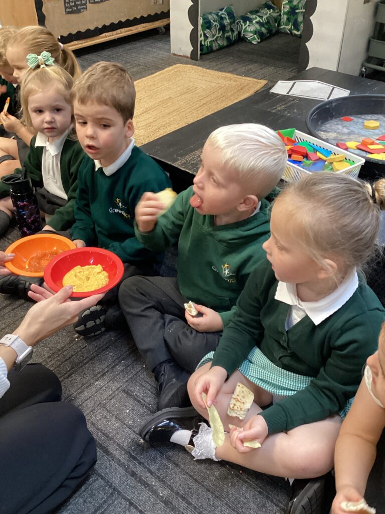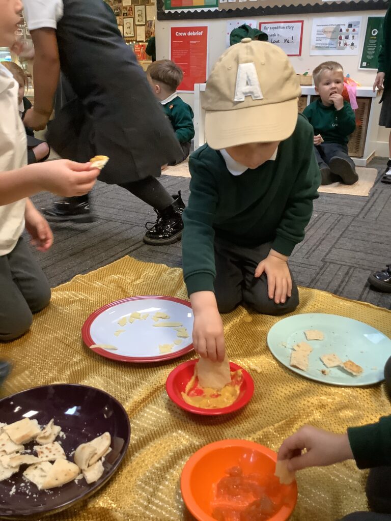 We then used our senses to smell, touch and taste some Indian foods. Some children showed courage by trying something new, you can see by their faces if they enjoyed the taste or not. Mango Chutney was a big hit with many children and they enjoyed dipping naan breads and popadoms into it.