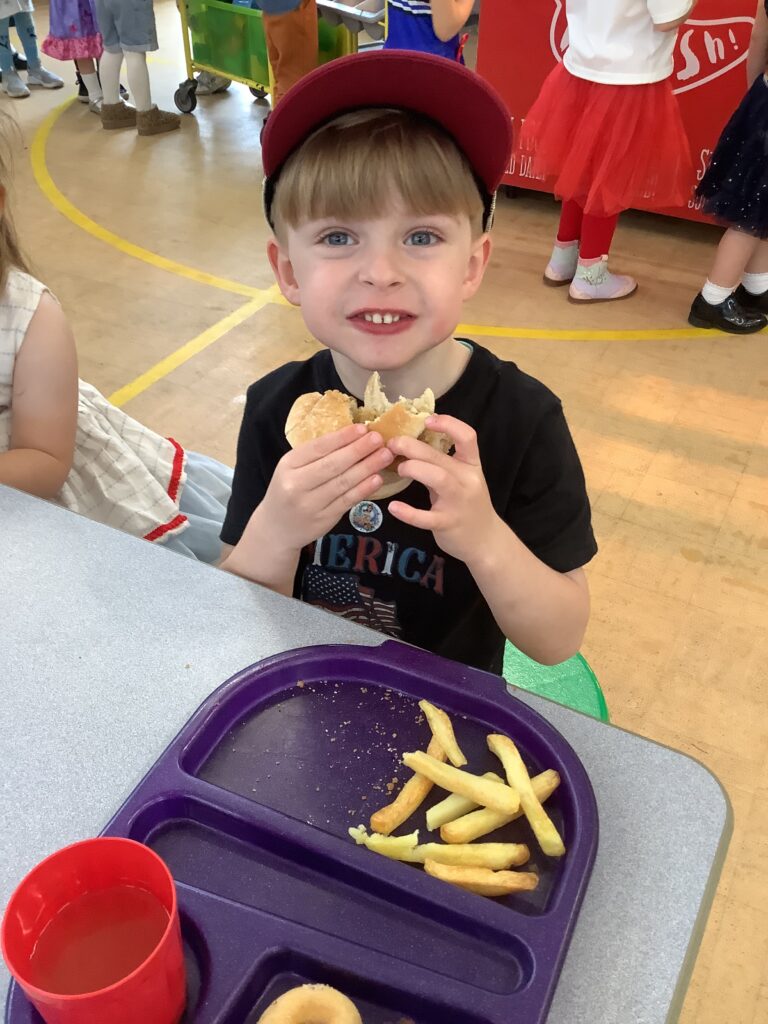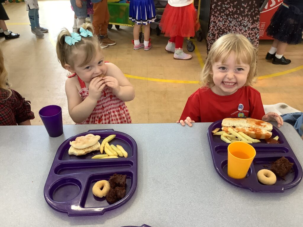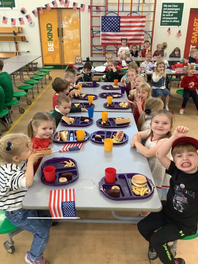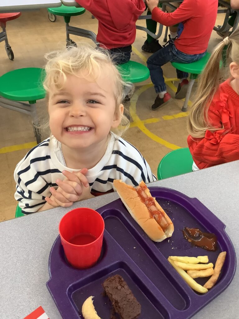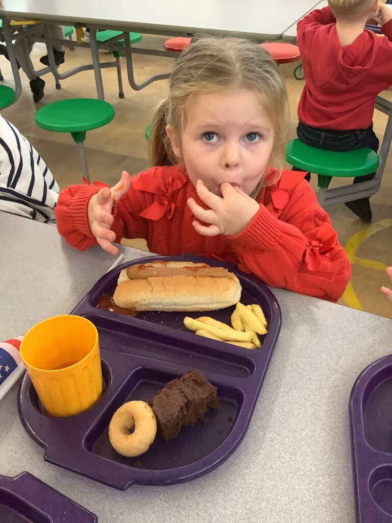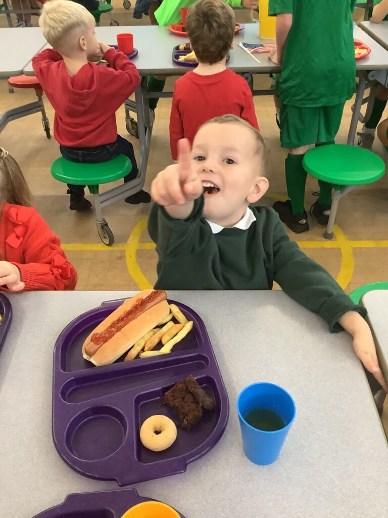 The children enjoyed a delicious lunch today of hot dogs, chicken burgers, chips, chocolate brownie and donuts. What a delicious treat for our American day!