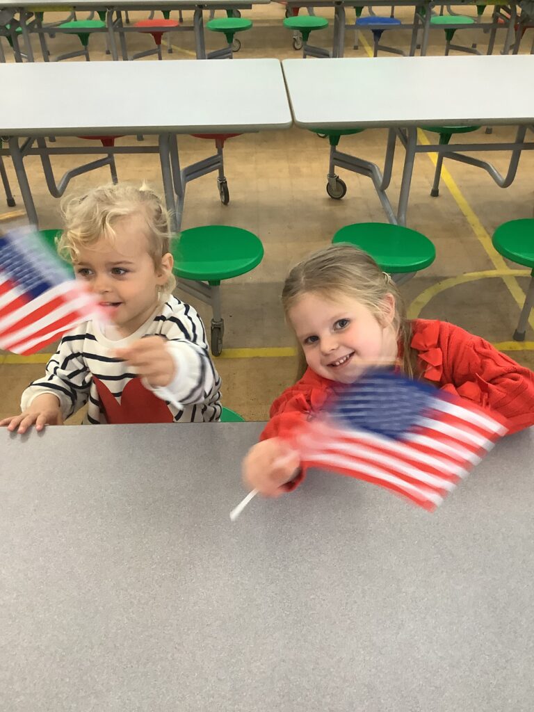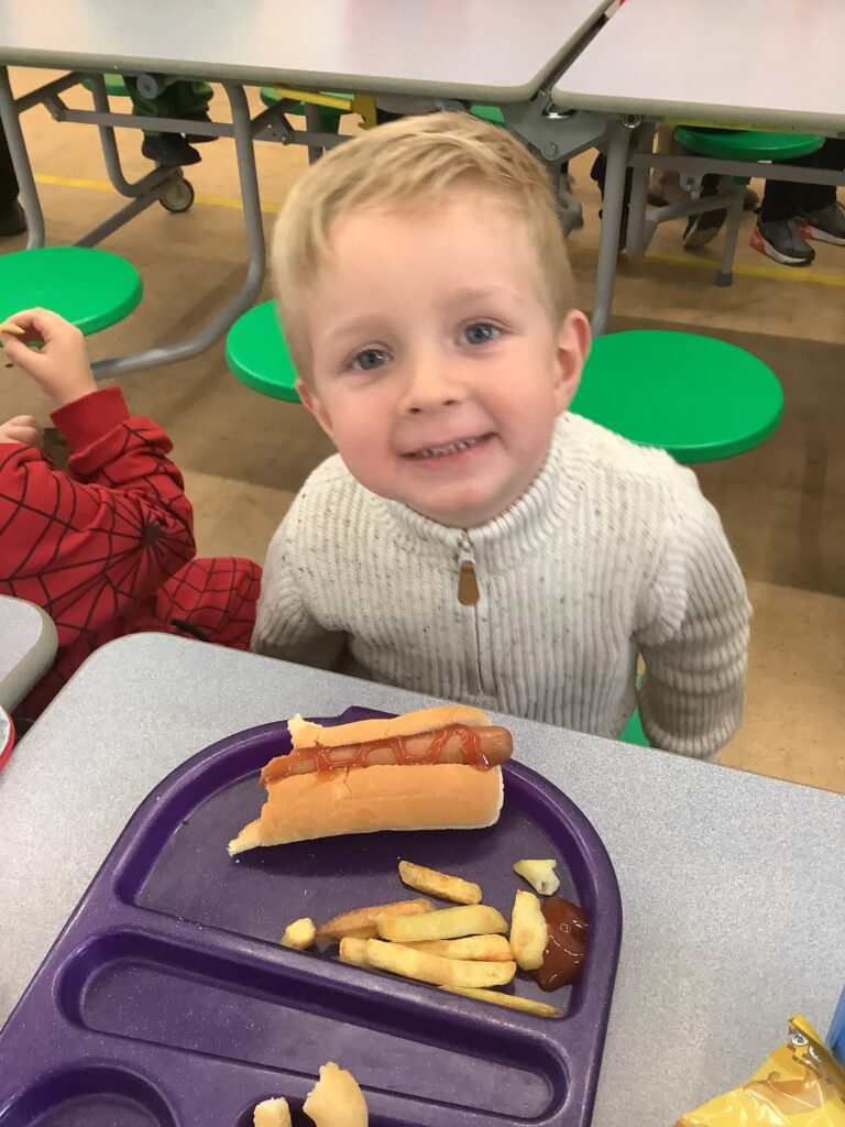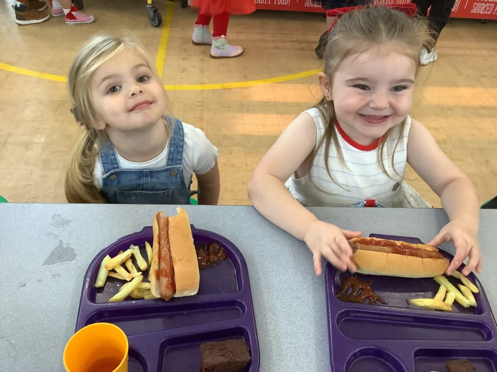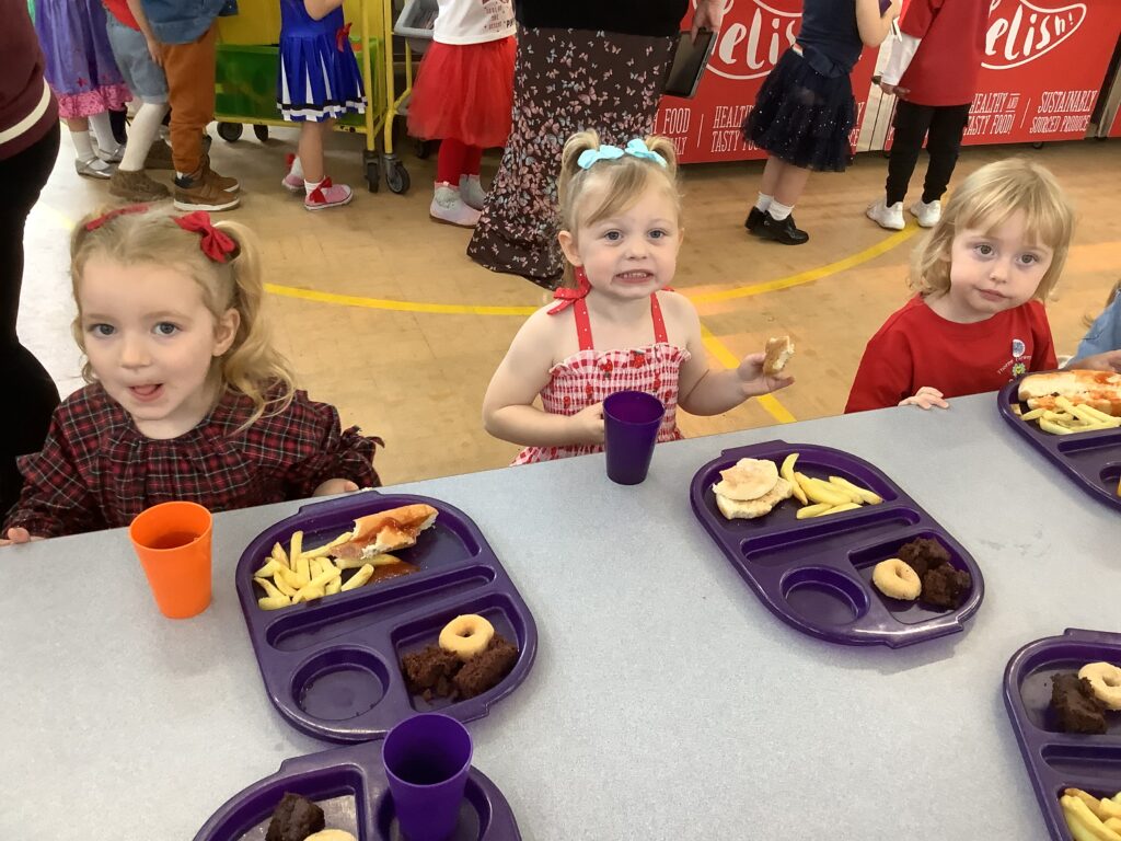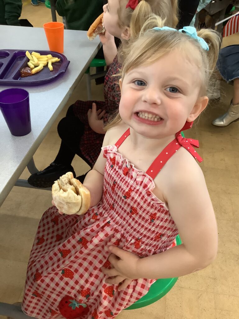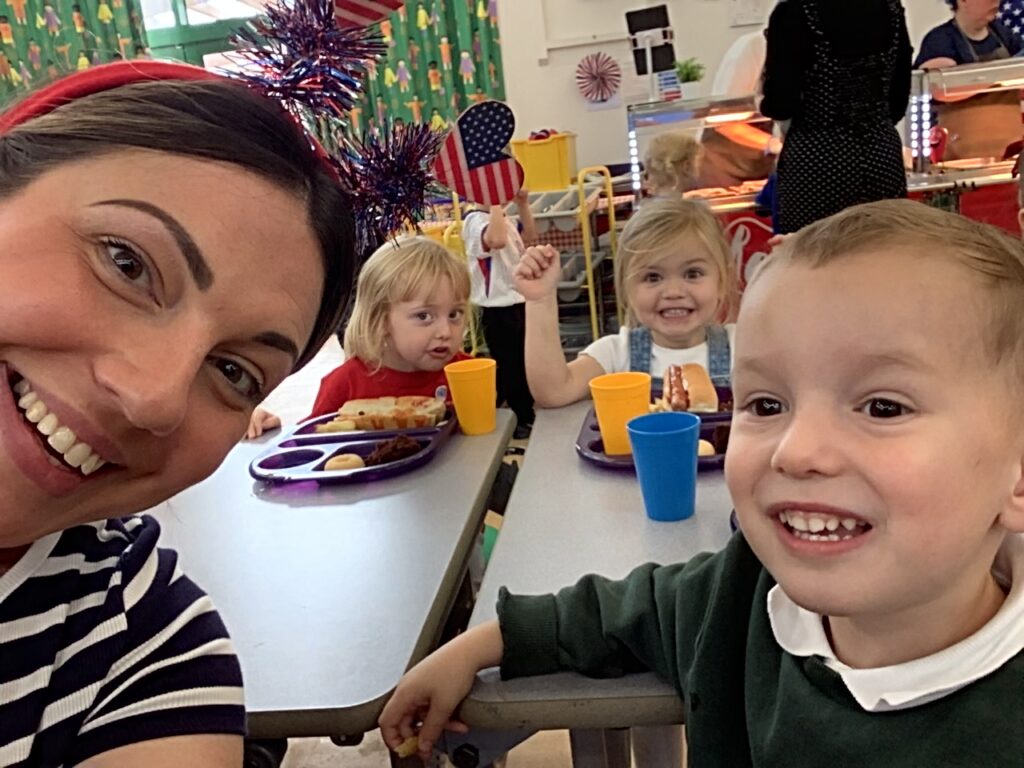 The children enjoyed a delicious lunch today of hot dogs, chicken burgers, chips, chocolate brownie and donuts. What a delicious treat for our American day!