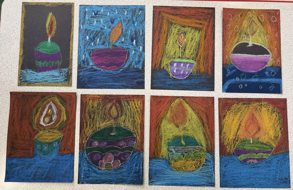 We looked at some examples of the beautiful Diwali lamps which might be used to celebrate Diwali 2025 (this coming Monday), and we created some beautiful artwork using oil pastels on black card. Well done everyone, we are so impressed with your gorgeous creations!