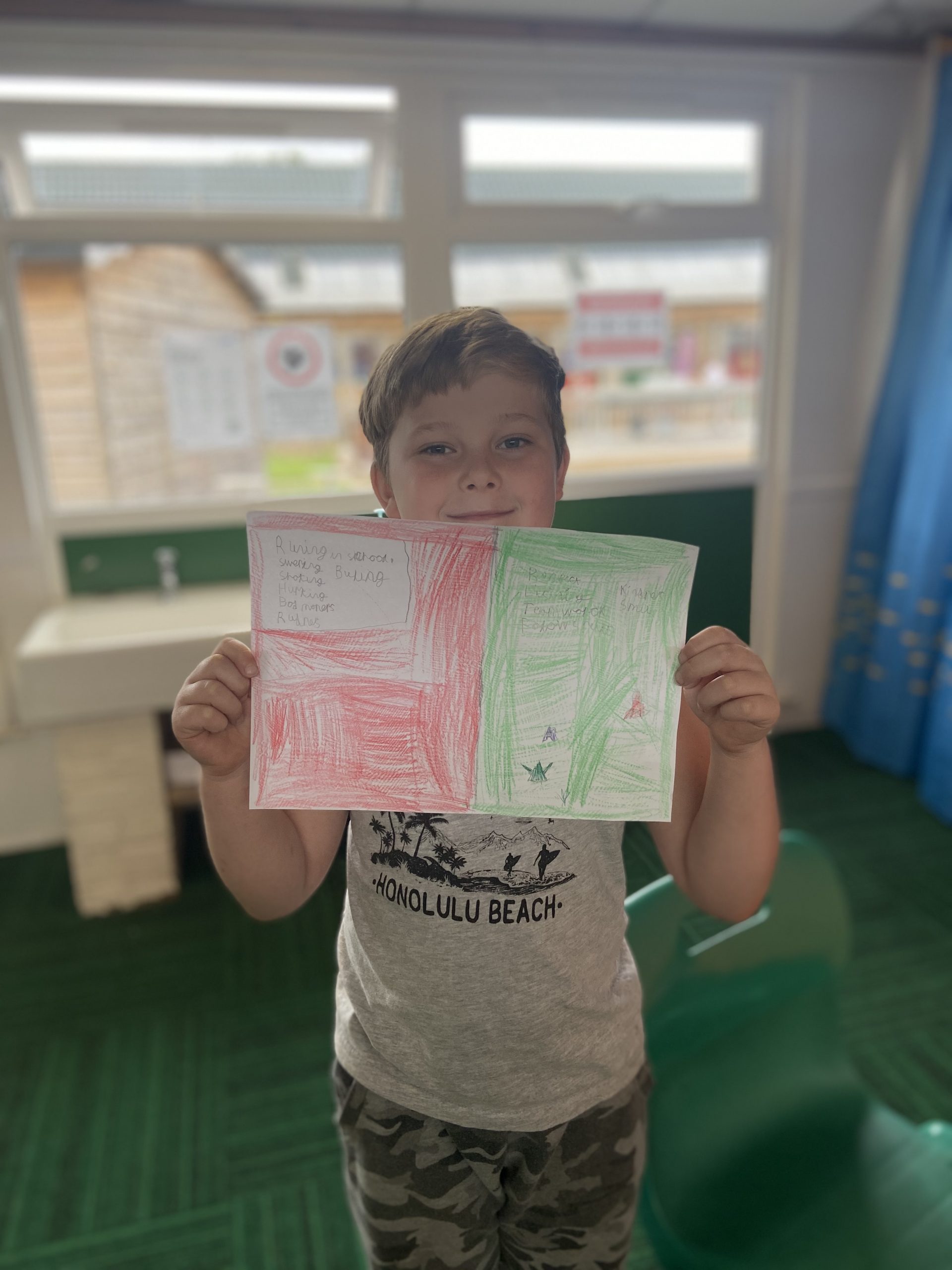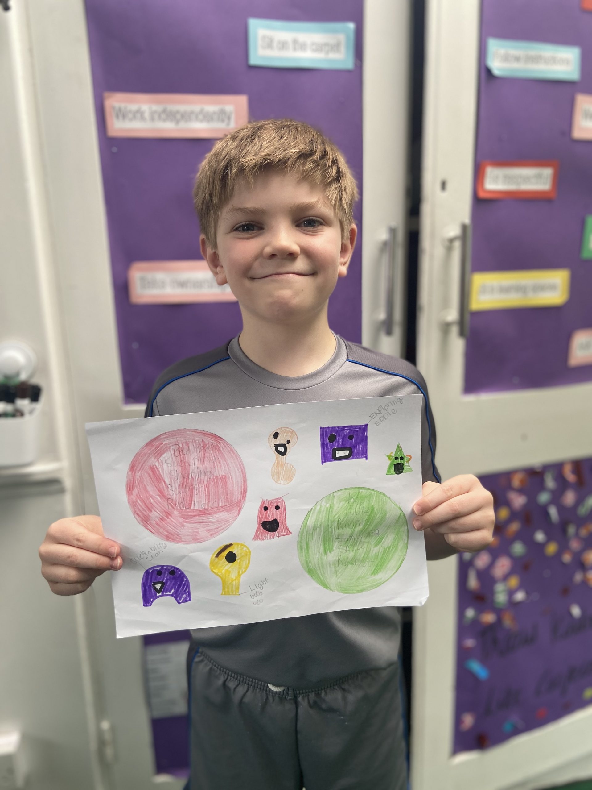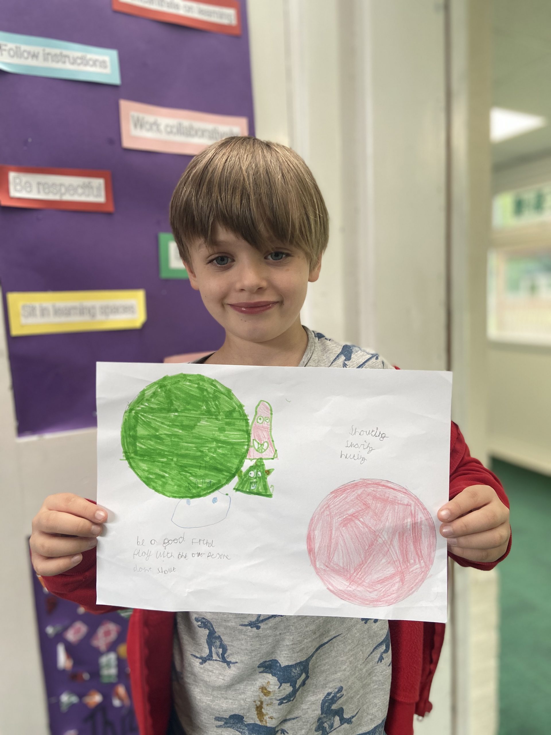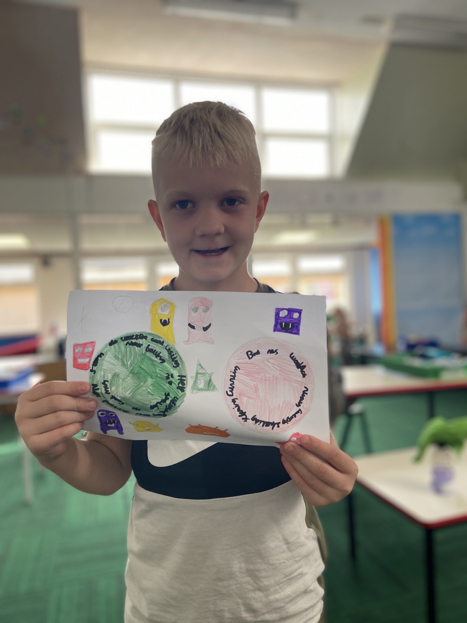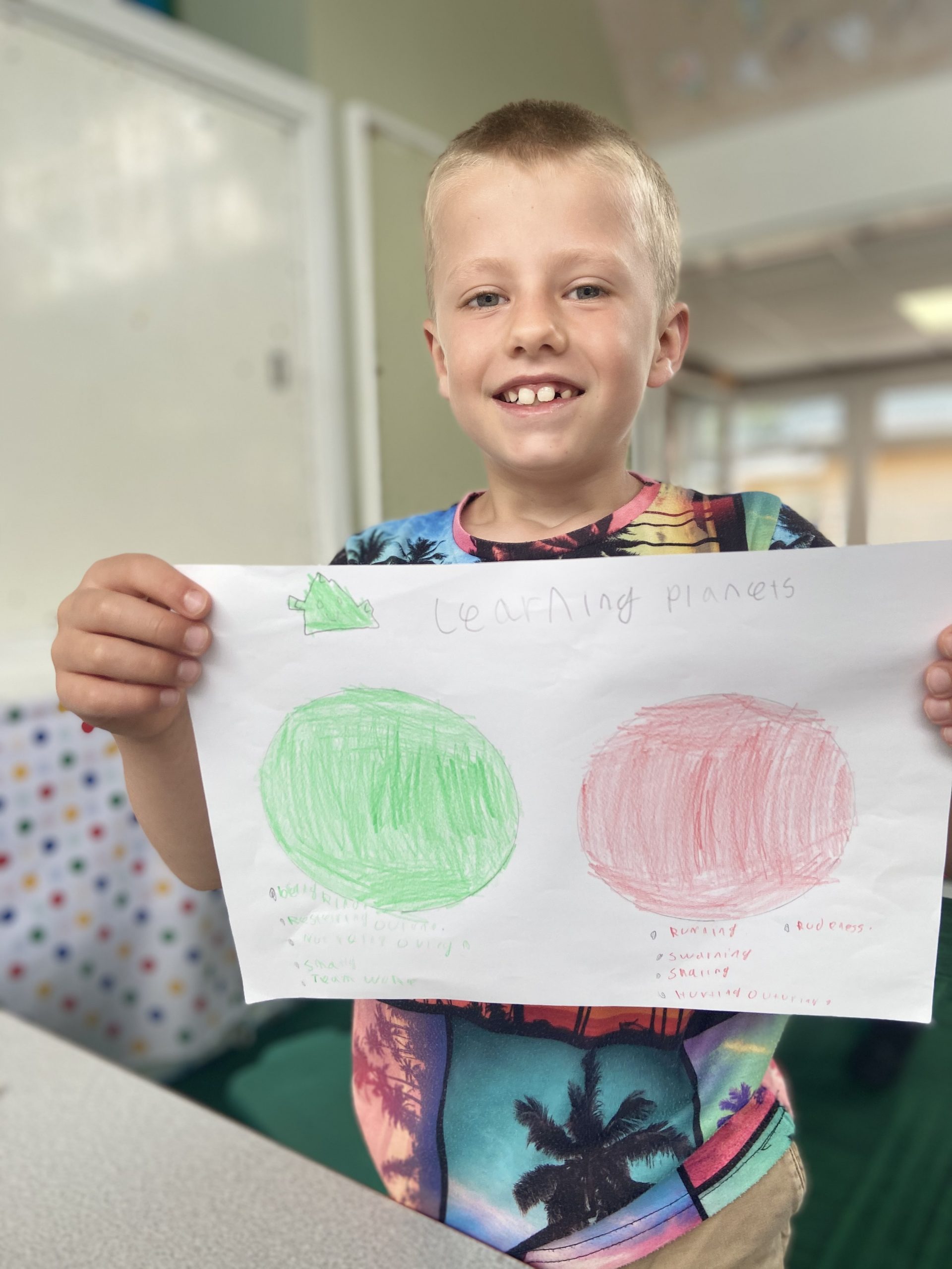 Danny, Elliott, Henry, Jack, Jack, Max and Roan have been super busy creating their learning planet posters this week. They have thought really hard about what kind of behaviours belong on the green and red planets and were very grown up when explaining why we should aim to be on the green planet! Great work boys! 😀